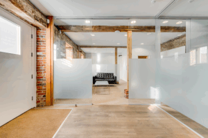 Part of the ground floor of the office has wooden flooring together with glass partition.